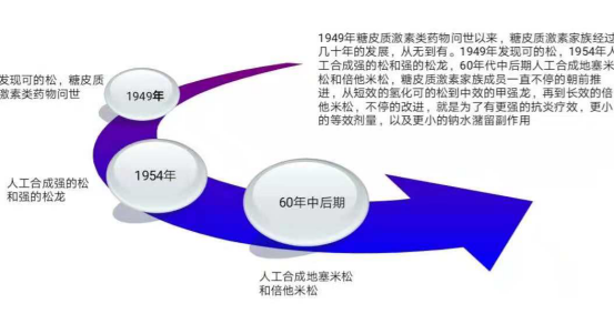 1949年糖皮质激素类药物问世以来,糖皮质激素家族经过几十年的发展,从无到有。1949年发现可的松,1954年人工合成强的松和强的松龙,60年代中后期人工合成地塞米松和倍他米松,糖皮质激素家族成员一直不停的朝前推进,从短效的氢化可的松到中效的甲强龙,再到长效的倍他米松,不停的改进,就是为了有更强的抗炎疗效,更小的等效剂量,以及更小的钠水潴留副作用。