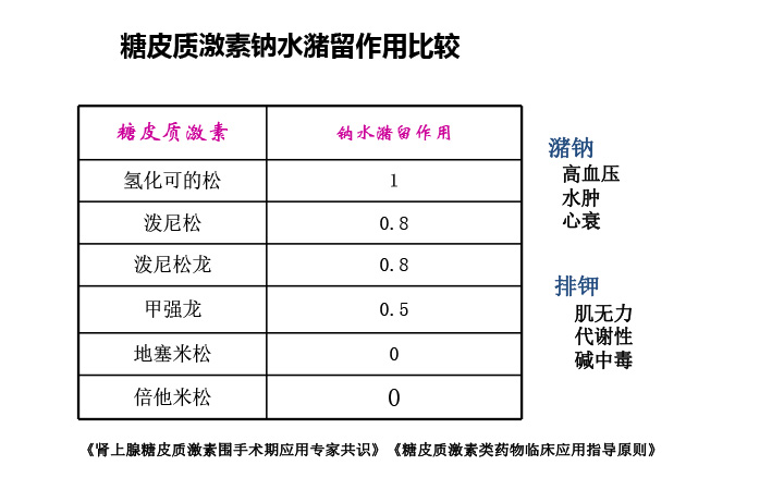 钠水潴留会引起高血压、水肿、心衰、肌无力、代谢性碱中毒严重的副作用。把氢化可的松的钠水潴留副作用作为基础参数1来对比,甲强龙比值降了一半,为0.5,倍他米松比值为0,在钠水潴留方面没有副作用。