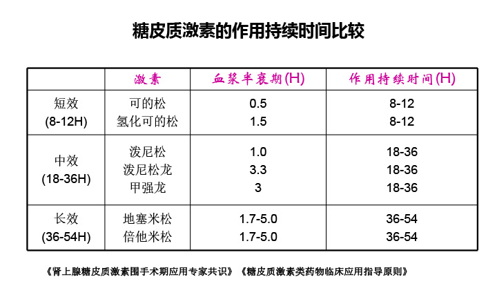 氢化可的松作用持续时间为8-12小时,泼尼松、甲强龙的作用持续时间为18-36小时,长地塞米松、倍他米松的作用持续时间为36-54小时。